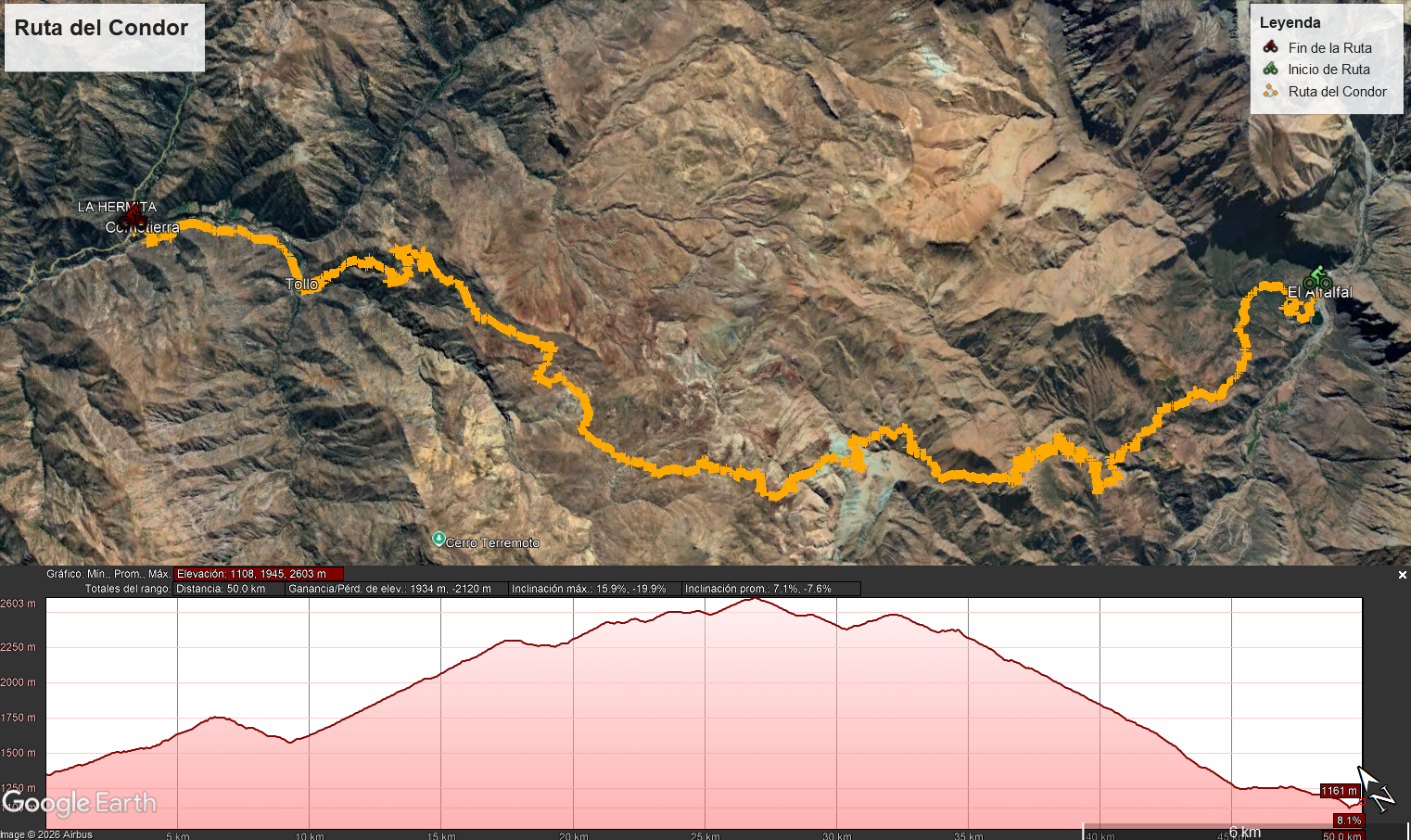 ¡Prepárate para conquistar la Ruta del Cóndor, un desafío diseñado exclusivamente para los amantes del mountain bike a nivel experto! Esta epopeya sobre ruedas se inicia en el pintoresco pueblo del Alfalfal, marcando el comienzo de una travesía que te llevará por 60 kilómetros de terreno salvaje y espectacular.