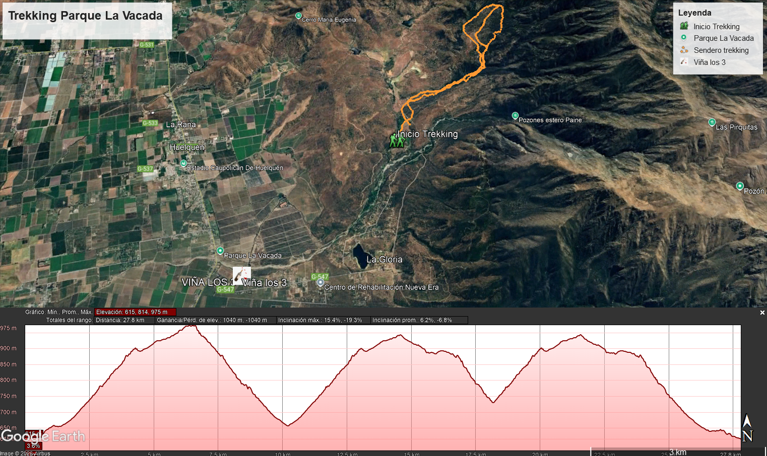 | Duración | • Distancia: 8 kilómetros (5 millas) • Duración de caminata: 2 a 3 horas • Tipo de terreno: Ripio • Altitud máxima: 862 m.s.n.m. • Desnivel acumulado: 324 mts. • Traslado en furgoneta: 120 min antes del trekking y 120 min después hasta el hotel |